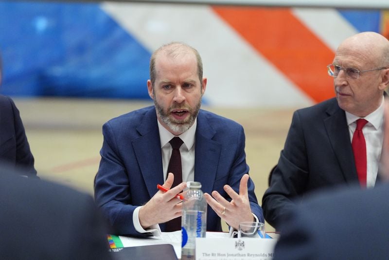 British business and trade minister Jonathan Reynolds was interrupted by protesters.