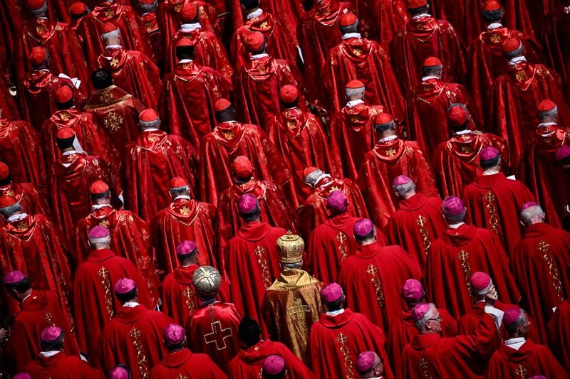 Rows of cardinals in their flowing bright red robes prayed and bowed their heads, nuns clutched rosaries and images of the pope, and pilgrims young and old battled with their exhaustion after waiting for hours.