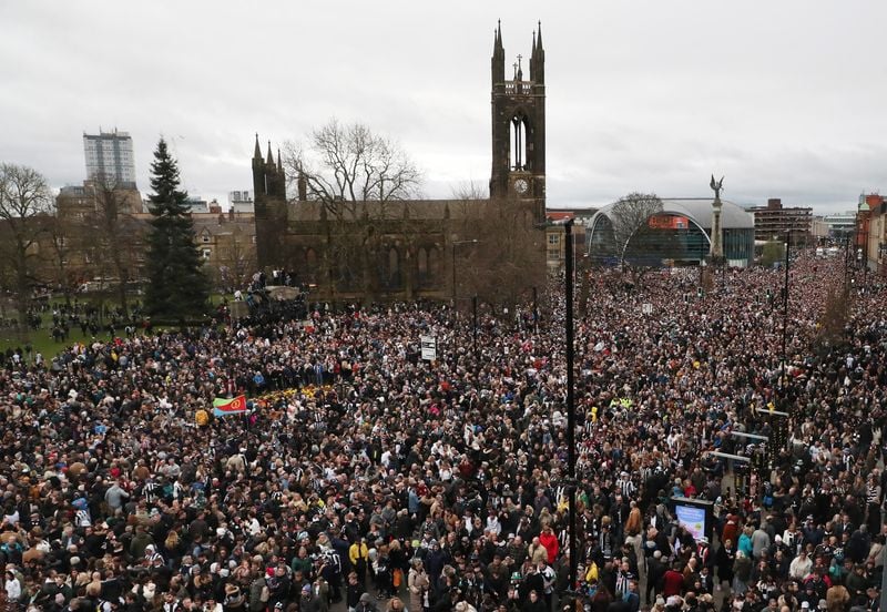 NEWCASTLE, England (Reuters) - Tens of thousands of Newcastle United fans gathered in the city on Saturday to celebrate the club's first domestic trophy in 70 years, with the streets turning a sea of black and white for the open-top bus parade.