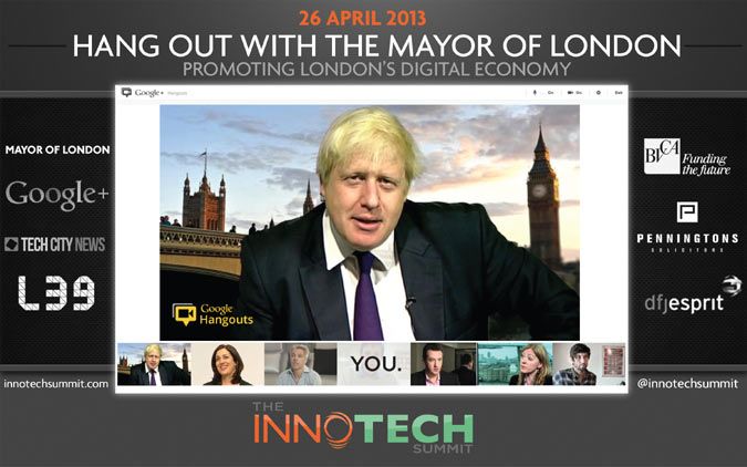 Boris Johnson will be exploiting the social media platform to help promote the UK’s growing digital economy by attracting inward investment. Commencing at 5pm BST from London, the Hangout will connect the Mayor with highly influential U.S. venture capitalists who will be joining the video chat from InnoTech Summits held at 9am PSD in Silicon Beach (ROC, Santa Monica, LA) and San Francisco (Bloomberg office). This includes FeldaHardymon, Partner at Bessemer Venture Partners, Alastair Mitchell, CEO and Co-Founder of Huddle, and Mark Terbeek, Partner at Greycroft (venture capital for digital media startups).