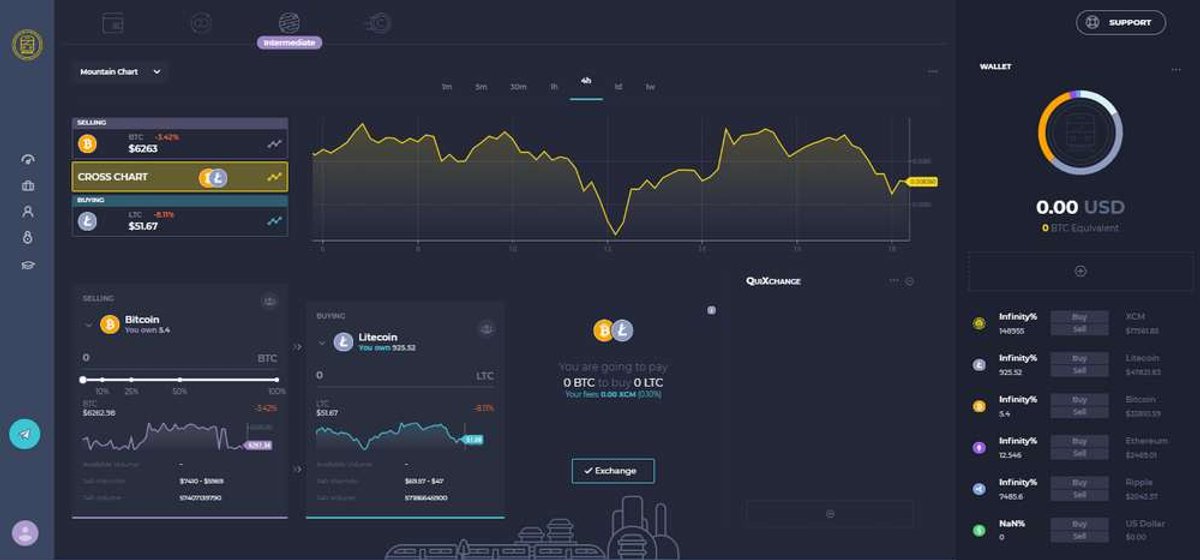 CoinMetro’s ‘intermediate exchange’, by contrast, offers a broader range of features for price monitoring and analysis. Here, users will find multiple charting options, including candle, mountain, bar, and line charts. At the top of the screen, users will find an adjustable price history for cryptos, fiat currency, and cross charts between two selected currencies. In the lower left-hand corner, the intermediate exchange presents ‘exchange cards’ containing price and volume information. Here, quantities can be tuned with a selection slider, and transactions are confirmed with double-click execution. A “QuiXchange” allows users to save their favourite pairs to exchange, enabling rapid switching between trading pairs.