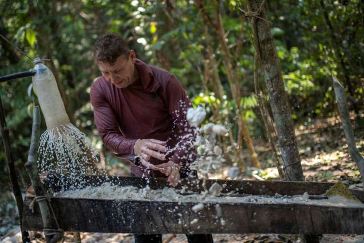 Alemão, a wildcat miner in Brazil’s Amazon, sifts through excavated rock for gold in a protected reserve in Para state, August 20, 2020. Thomson Reuters Foundation/Lucas Landau