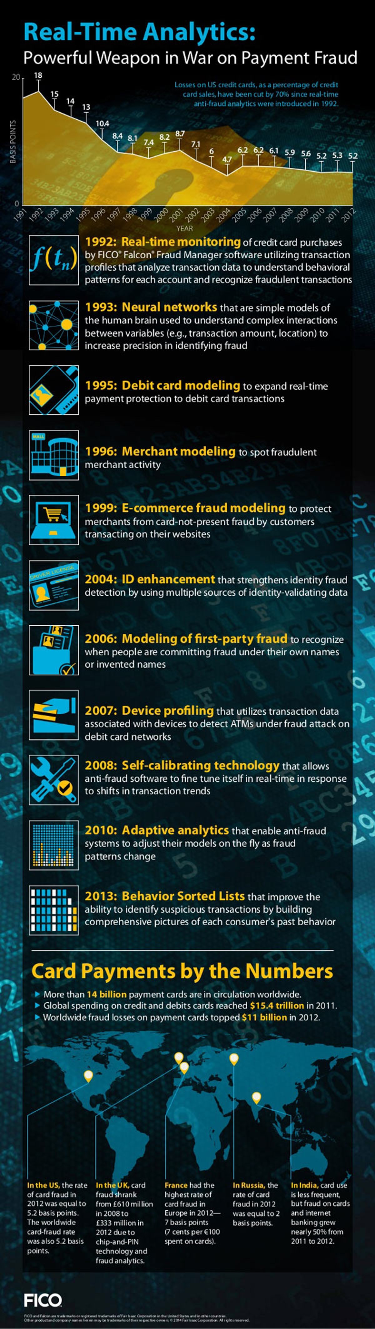 FICO (NYSE:FICO), a leading predictive analytics and decision management software company, released an infographic showing how 20+ years of analytics innovations have protected consumers from payments fraud. The infographic tracks the evolution of real-time fraud monitoring for payment cards from its inception in 1992 through today. During that time, for example, payment fraud as a percentage of all credit card transactions in the U.S. has dropped by more than 70 percent.