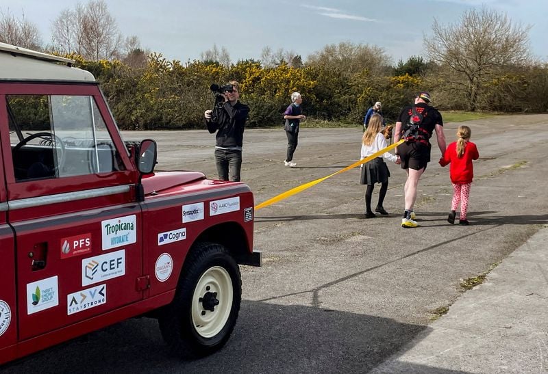 CAMBERLEY, England, March 20 (Reuters) - Strapped into a harness attached to a rope and a gleaming 1.5‑ton vintage Land Rover, British army veteran Darren Hardy leaned forward, braced himself, grimaced and began to pull.