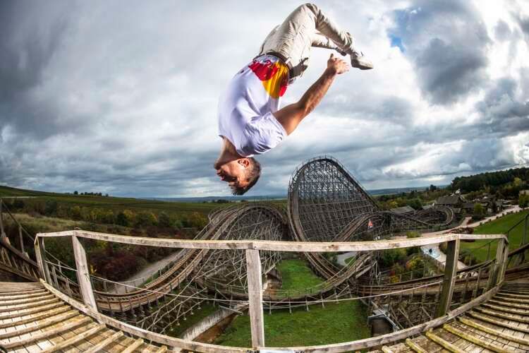 – The resulting film, Jason Paul’s Wild Ride, sees the trio performing flowing freerunning moves at heights of over 30m on the structure of the park’s roller coaster, Mammut.