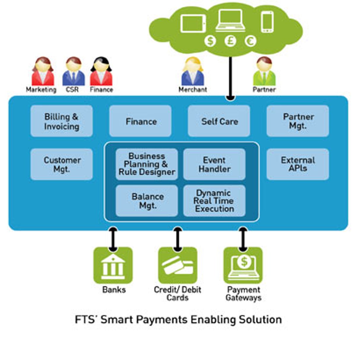 FTS’ Smart Payments Enabling Solution automates the billing and settlement functionality of payment systems, working with payment service providers (PSPs), independent sales organizations (ISOs), online merchants and merchant acquirers to make the payment process, especially those involving multiple parties, smoother, easier and simpler to manage.