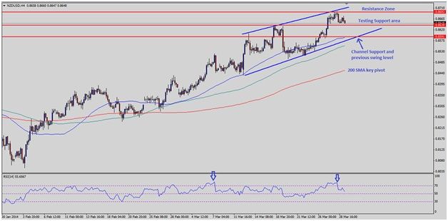 NZDUSD extended the upside movement during last week, and challenged 0.8700 physiological level. There is a channel forming on the 4 hour timeframe with resistance around recent 0.8695 high. As of writing, the pair is flirting with 0.8640 support level, which also represents the March 18, 2014 high. This level can hold the downside in the pair for now. A break and close below the mentioned spike level might open the doors for further downside acceleration towards the channel support zone. 50 simple moving average is also moving along the channel support zone, which signifies the importance of channel.