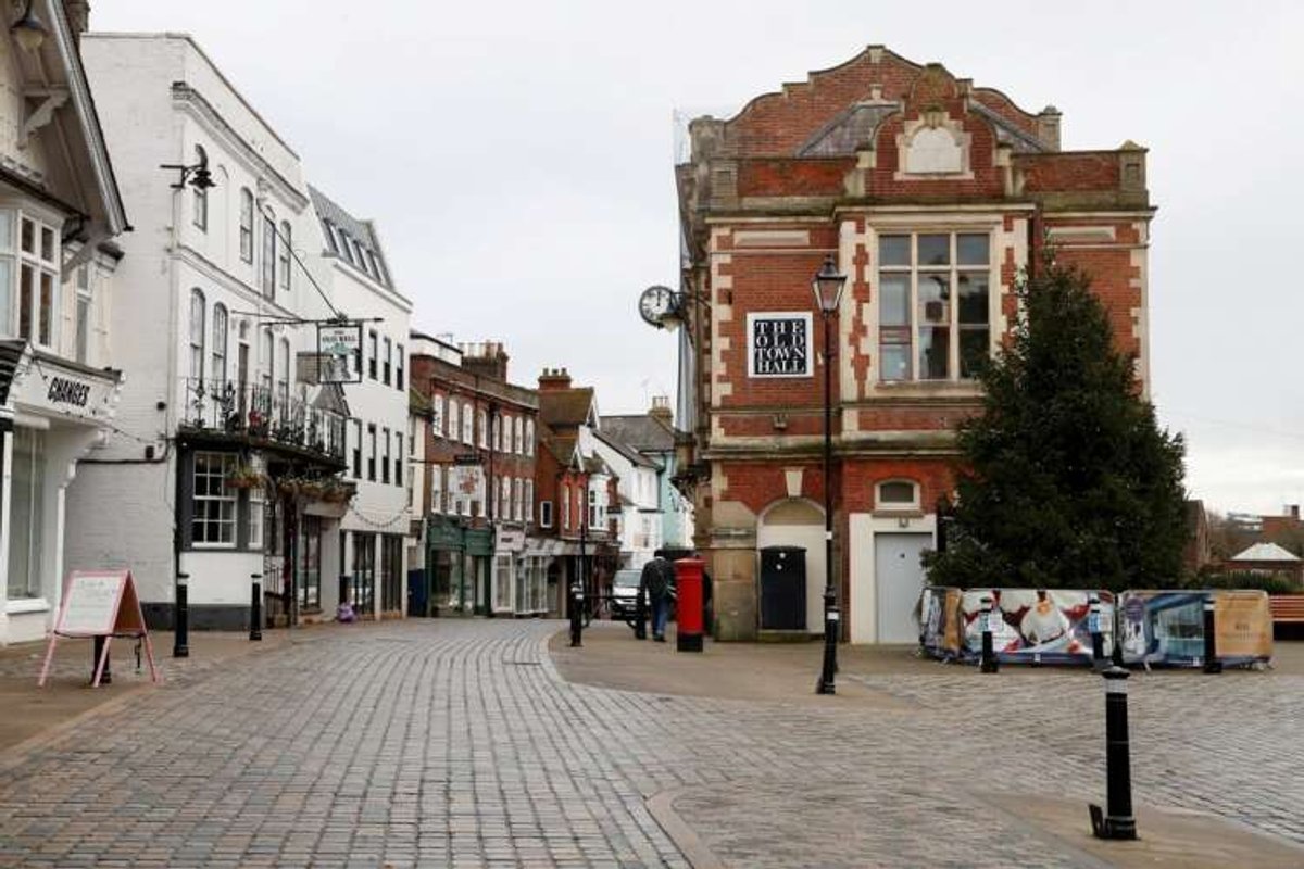 The image depicts a deserted street in Hemel Hempstead, symbolizing the economic challenges faced by the UK amid ongoing COVID-19 strains. This visual relates to the Reuters poll discussing the UK economic recovery and potential threats.