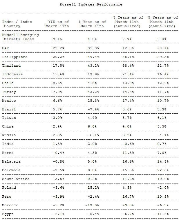The Russell Emerging Markets Index has returned 3.1% year-to-date as of March 11th. However, within the Index, certain country constituents have significantly outperformed this level of return with United Arab Emirates taking the lead and returning 23.2% YTD.